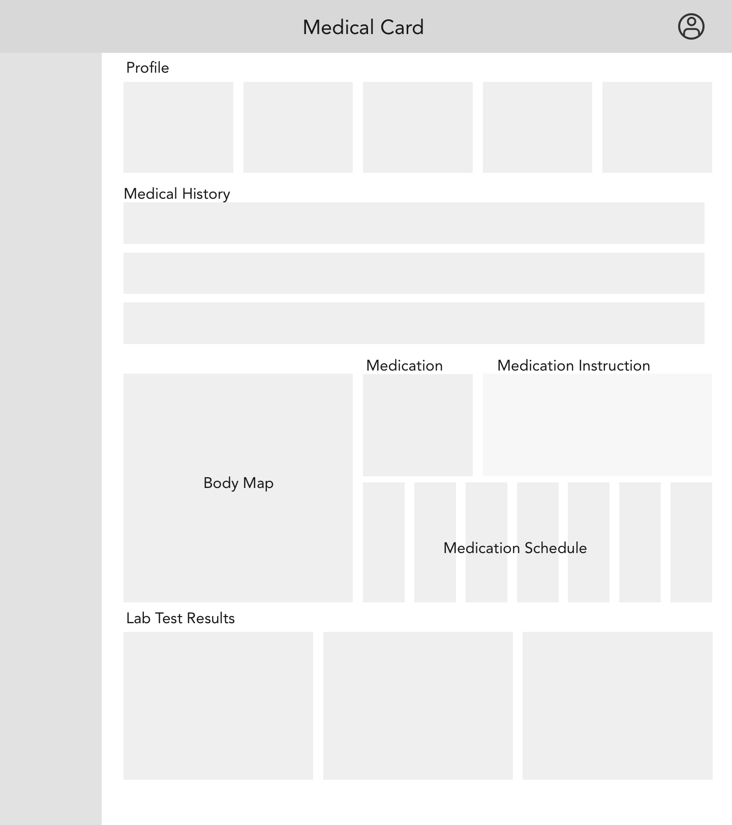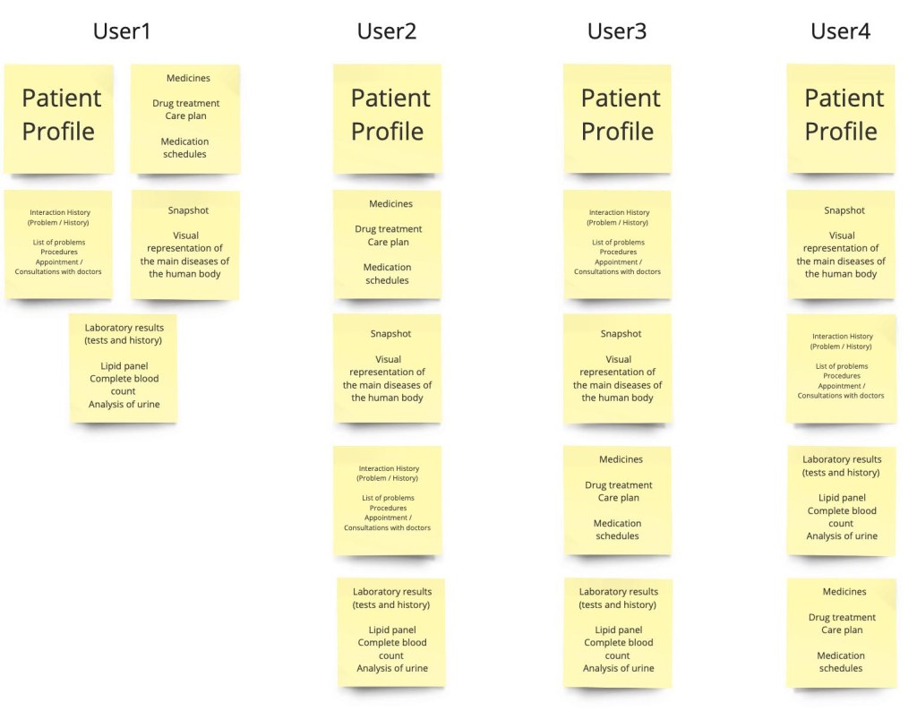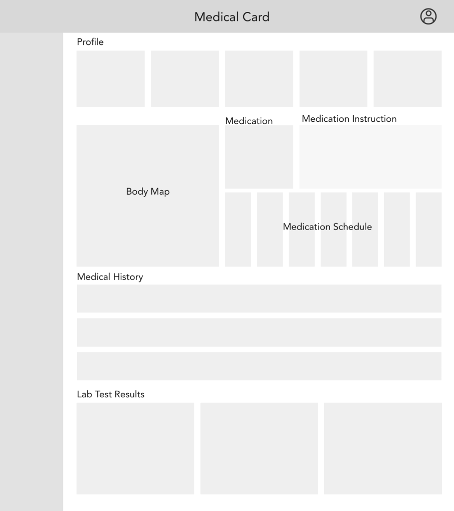 I also conducted a card sorting workshop with users. I asked them to sort the required elements (patients profile, medication schedule, body map, medical history, lab test results) in the order of importance. Specifically, I asked them what they would like to see at the top page, and which elements could be placed lower on the page. These suggestions influenced my thinking about the layout of the interface.