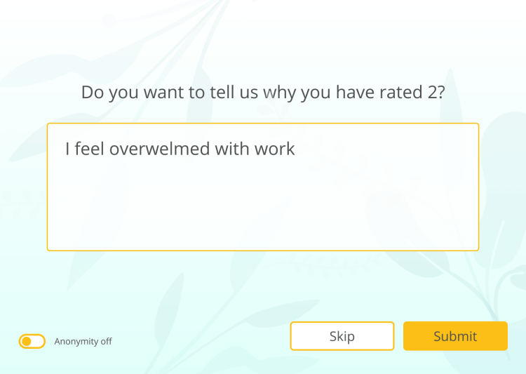 This can be resolved by providing a regular (anonymous) feedback system, that allows employees to check-in their feelings and book 1-on-1s if they need to talk to someone.