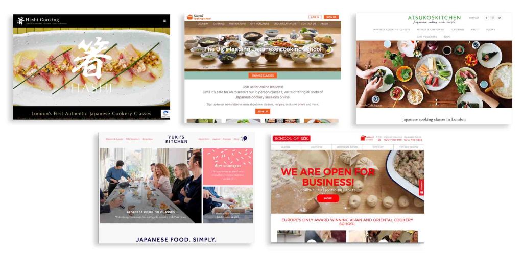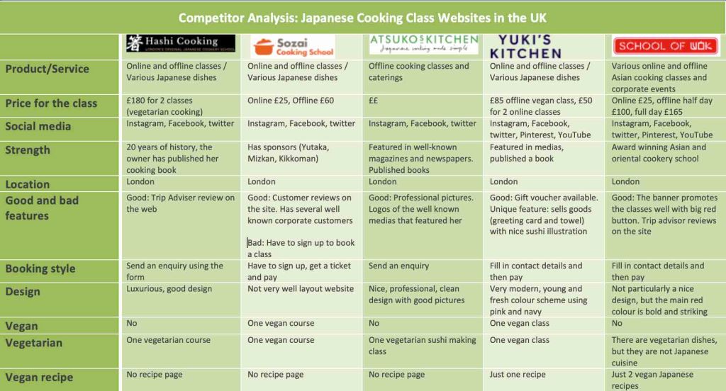 In the beginning of the project, I conducted a market research and competitor analysis, and I found that there was no vegan specific Japanese cooking class business in the UK. There were five major Japanese cooking class businesses in the UK with online presence. Two of them did offer a vegan class, but the rest of the classes were all non-vegan. Three other competitors did not offer any vegan classes. This gave me the confidence that my client was in a good position to start her business in this niche.
