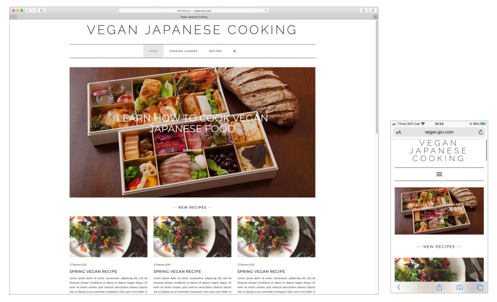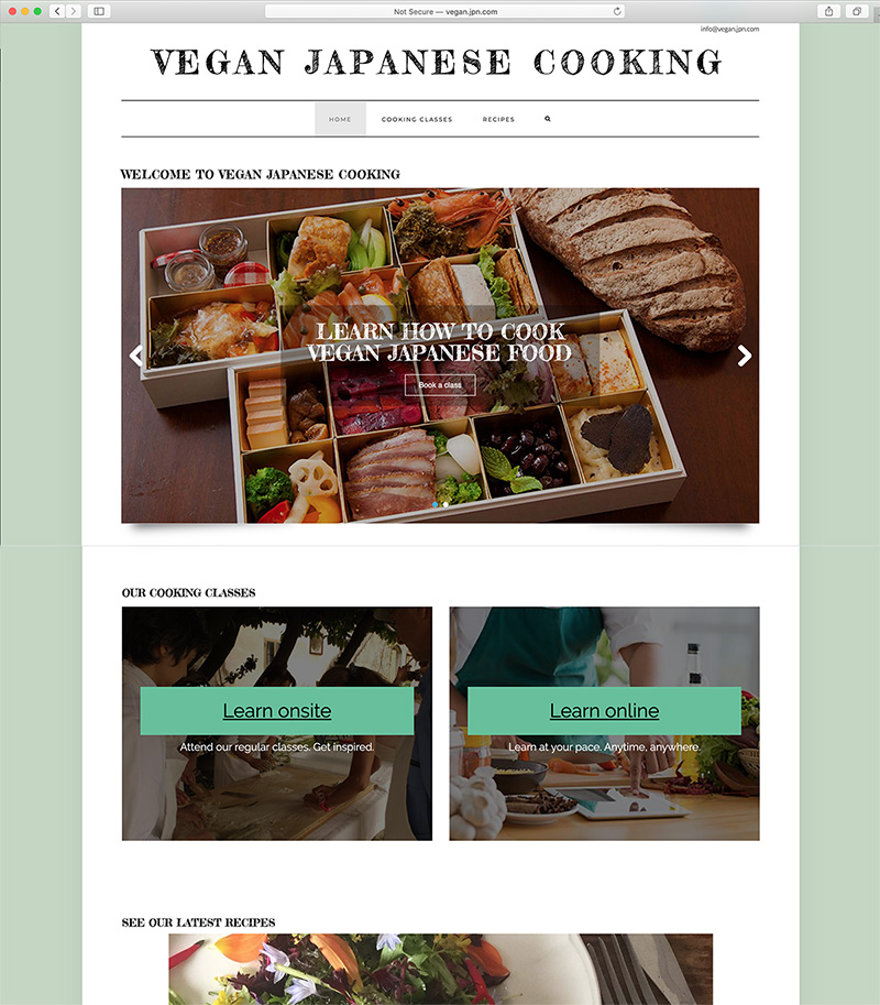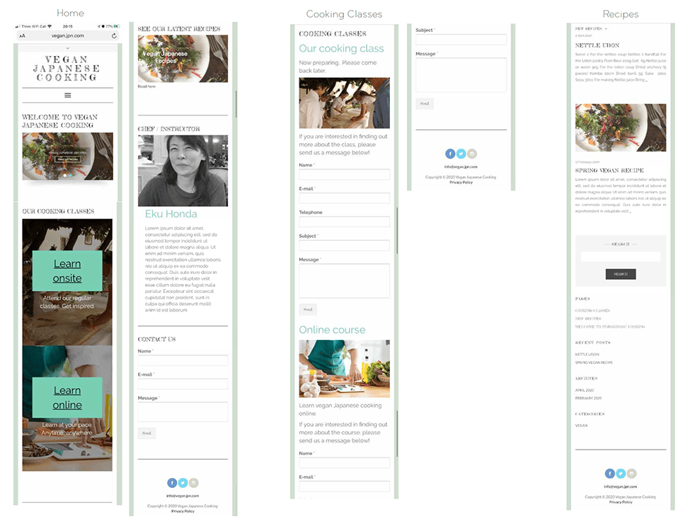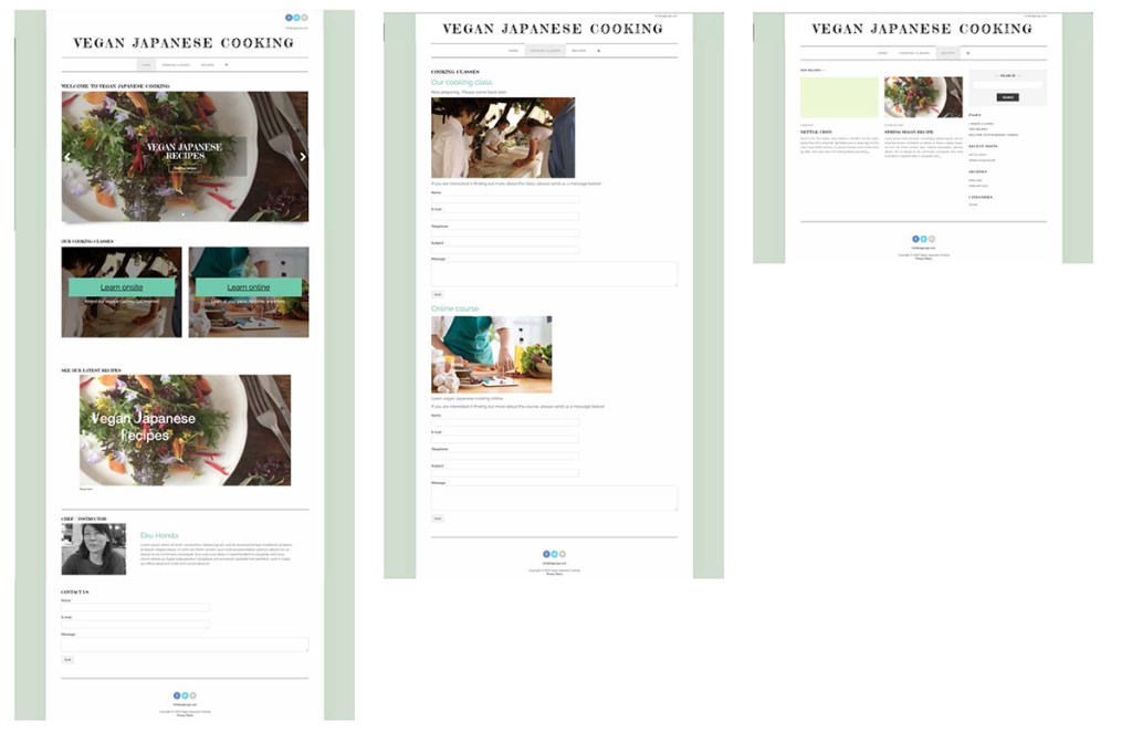 I also asked my client to tell me more about her customers. The classes would be taught in English, so her clients would be mainly non-Japanese people who were vegan and interested in learning about the Japanese cuisine and culture. The age range would vary, so I decided to design the website in the style that could appeal to wider generation.